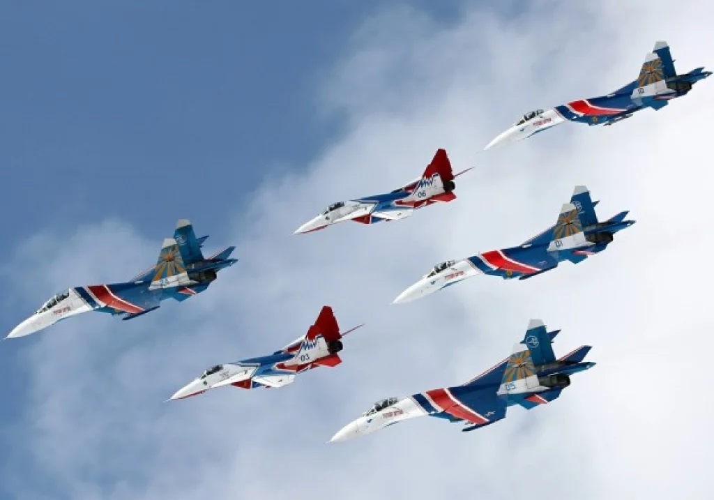 Отметим, что «Русские Витязи» уникальны тем, что это единственная пилотажная команда в мире, выполняющая высший групповой пилотаж на тяжелых истребителях, которые являются серийными строевыми самолетами.