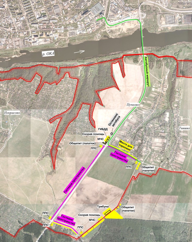 Центром мероприятия станет поле за деревней Пучково. Если ехать со стороны моста – с левой стороны. Там разместятся парковки, трибуны для зрителей и торговые палатки.