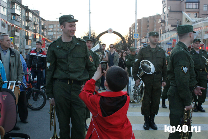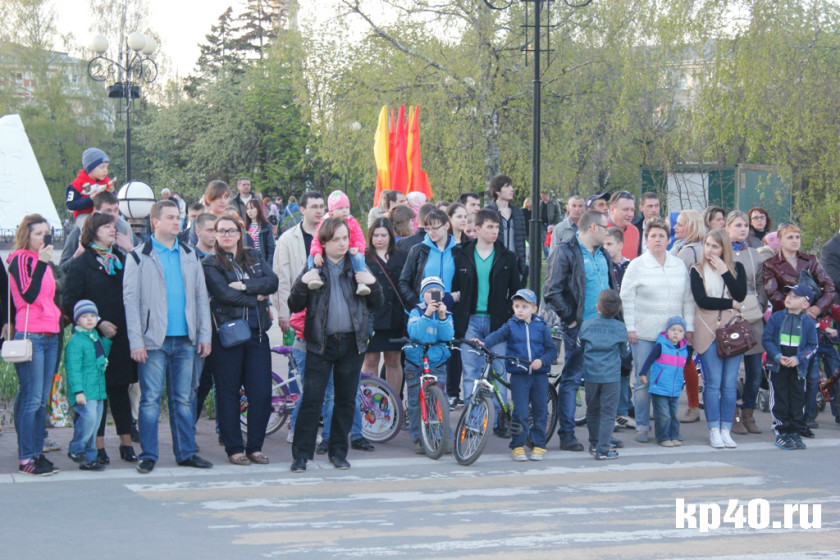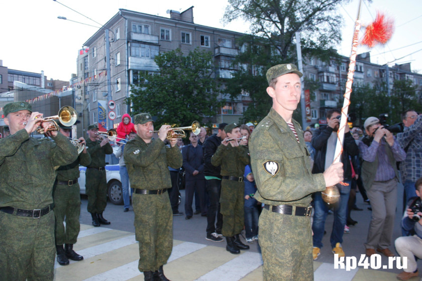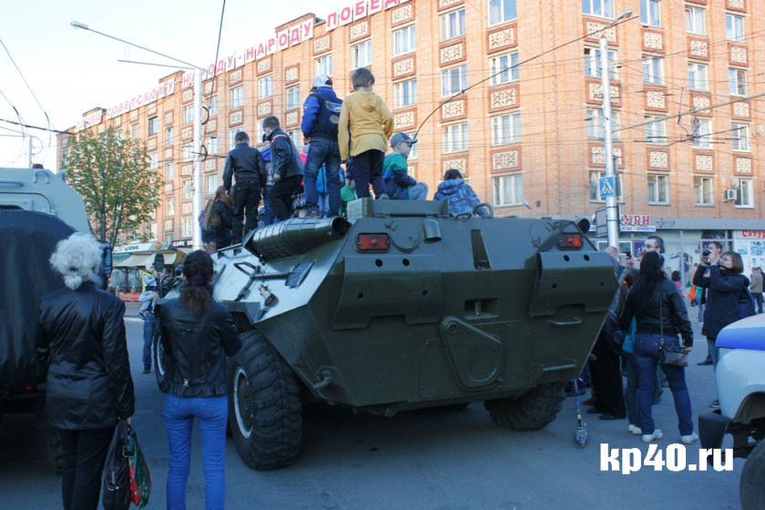 Репетиция торжественного шествия 9 Мая должна была начаться 6 мая в 20:00. Однако калужане стали стекаться на площадь Победы минут за 45 до назначенного времени. В ожидании начала действа кто-то просто прогуливался, кто-то пытался рассмотреть укутанный в полотно памятник Жукову, многие фотографировали шеренги военных, принимавших участие в репетиции шествия. Те немного смущались от внезапно обрушившейся на них популярности и внимания.
