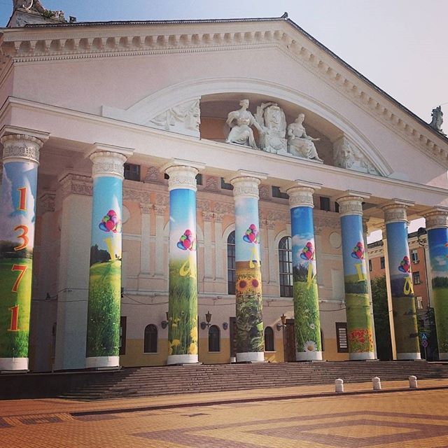 На днях в Калуге колонны драмтеатра обернули пейзажными плакатами. Эта декорация приурочена ко Дню города.