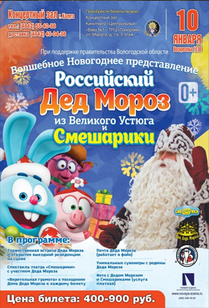 16:00 Впервые в Калугу из Великого Устюга приедет тот самый Дед Мороз, которому дети пишут письма каждый год. Он встретит маленьких участников в тронном зале, чтобы пообщаться с каждым. А затем дети и родители увидят 4 поучительные истории с героями известного российского мультфильма «Смешарики».