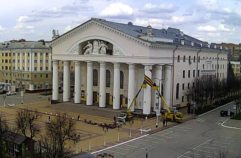 Днём в понедельник, 25 апреля, колонны драмтеатра в Калуге начали украшать георгиевскими лентами. Такое же украшение ко Дню Победы использовалось и в прошлом году.