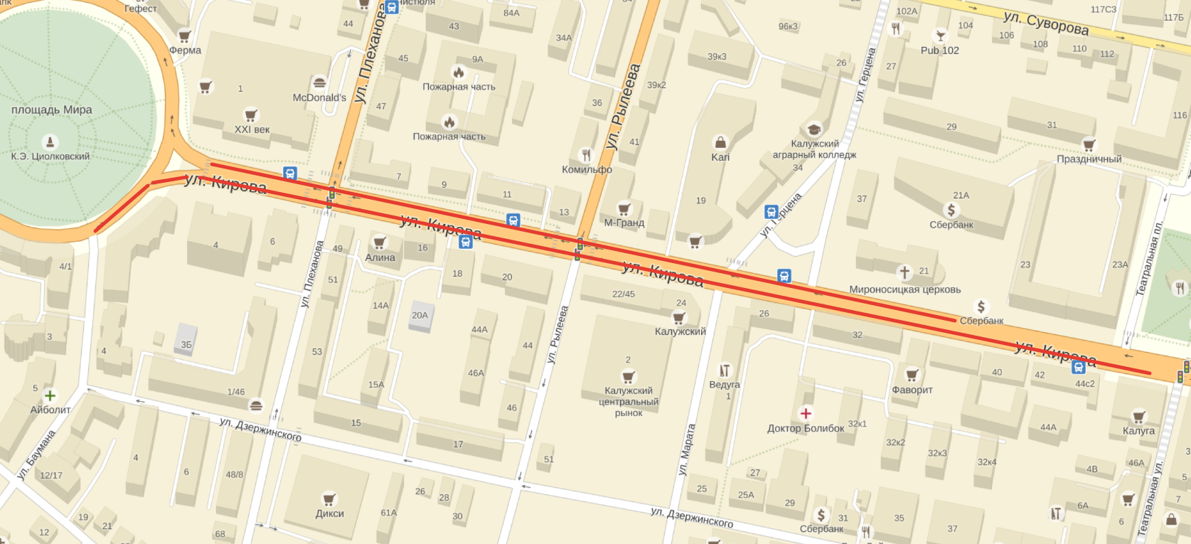 Мы учли и то, что шествие шло по двум сторонам улицы Кирова и, фактически, состояло из двух колонн, причём правая была заметно длиннее левой. Это хорошо видно на схематическом изображении, которое иллюстрирует, как в итоге растянулось шествие. Естественно, мы не включили в расчёт ту площадь, что занимала техника, которая шла во главе левой колонны.