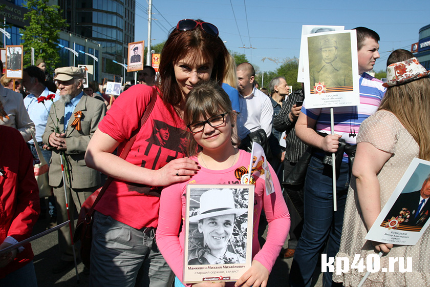 - Мы с дочерью Соней участвуем в этой акции впервые, - рассказывает Елена МАНКЕВИЧ. – В прошлом году 9 Мая мы были в Питере, видели, как проходит «Бессмертный полк» там. Масштабнейшее мероприятие, оно очень нас впечатлило, поэтому в этом году мы тоже решили принять в нём участие. Пришли с Сониным прадедушкой – Михаилом Михайловичем Манкевичем. Он воевал с первых дней войны, был контужен, полностью потерял зрение. После войны работал в школе, прожил долгую и хорошую жизнь.