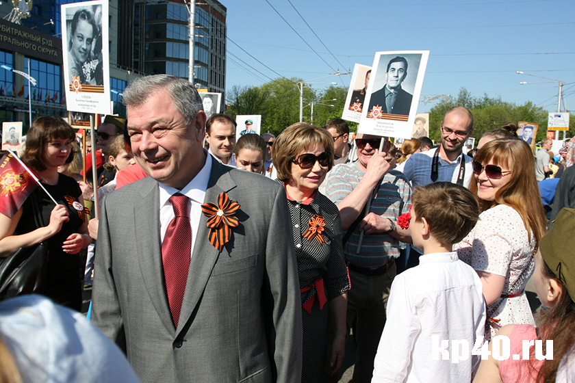 Анатолий Артамонов появился на улице Кирова незадолго до начала шествия. Вместе с супругой и детьми он прошёл через строй «Бессмертного полка». Штендеров с портретами родственников-ветеранов у главы региона не было. Их несли его дети. Артамонов возглавил колонну слева, а дети с фотографиями родственников-ветеранов шли в «правой» колонне.
