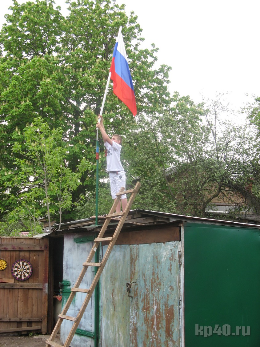 Начался праздник с Российского гимна. Под его звуки сын водружал над гаражами флаг России.