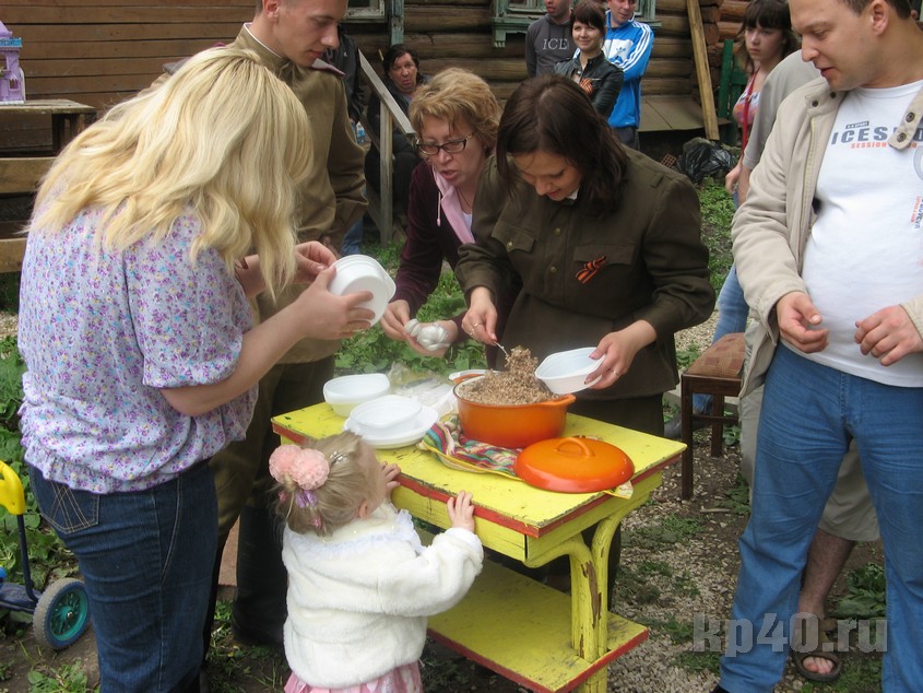 Дети и взрослые читали стихи. Звучали песни военных лет. Принять участие в концерте может любой желающий – это очень приветствуется. А ещё каждый год мы с соседями варим фронтовую кашу – гречку с тушёнкой. Заранее договариваемся, кто сколько каши готовит. Выносим её во двор и угощаем гостей.