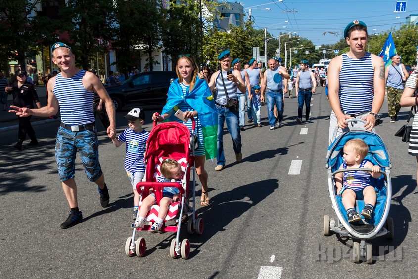Пройдя в составе колонны ВДВ, я пришла к выводу, что этот праздник практически семейный. Многие десантники были с жёнами и детьми. Те в поддержку мужей тоже облачились в тельняшки.