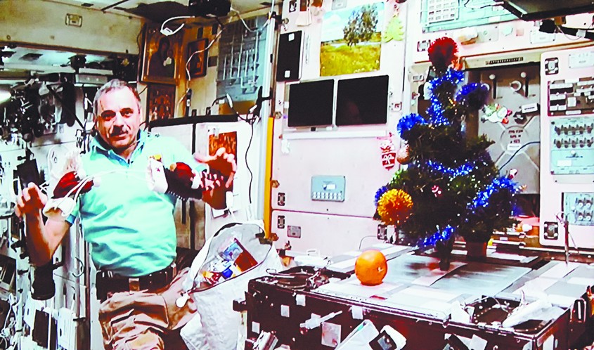 Я праздновал на станции два юбилея — 50- и 55-летие. Спиртного у нас нет, поэтому отмечали соком и чаем. Кроме того, у нас существуют так называемые бонусы — это то, что человек любит на Земле. Каждый перед полётом выбирает такие праздничные продукты. Собирается вся экспедиция — 6 человек, поздравляемся. За подарками в магазин никто сходить не может. Но наши американские, европейские коллеги подарили мне майки. До сих пор они у меня хранятся, я спустил их на Землю.