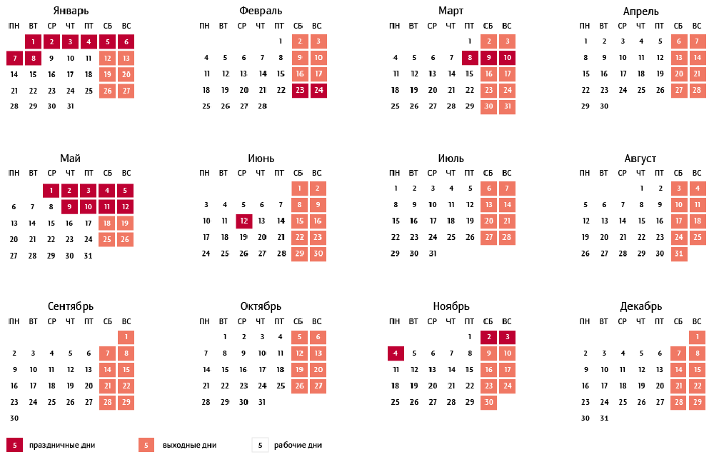 Новогодние и рождественские каникулы продлятся с 30 декабря 2018 года по 8 января. Выходными днями станут 23-24 февраля, 8-10 марта, 1-5 мая и 9-12 мая. 12 июня будет один выходной день, а в День народного единства нерабочими днями станут 2-4 ноября.