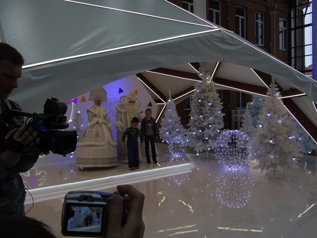 В фойе, где мы гуляли, располагается резиденция Деда Мороза. В Калуге это резной терем (Дом мастеров), по-новогоднему украшенный, с красивым троном, сверкающими гирляндами, ёлками, подарками и детскими поделками. Там сказочные персонажи встречают маленьких посетителей и водят экскурсии. В Туле я готовился увидеть нечто ещё более грандиозное. Но оказалось, что резиденция — просто белый плексигласовый шатёр. Открытая палатка. В ней стоит белый трон, на котором сидит Дед Мороз, все подходят и фотографируются с ним. Всё! И это новогодняя столица! Это было второе сильное потрясение. У нас всё намного круче!