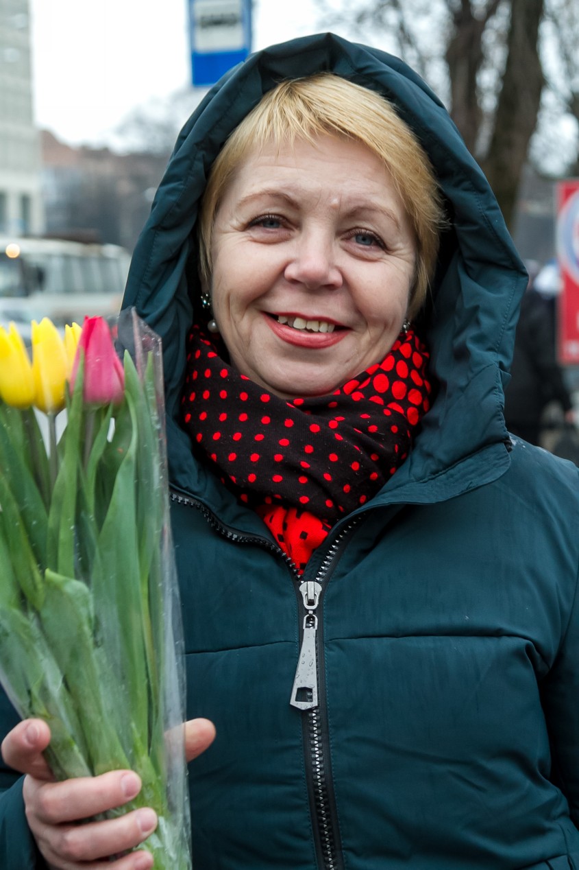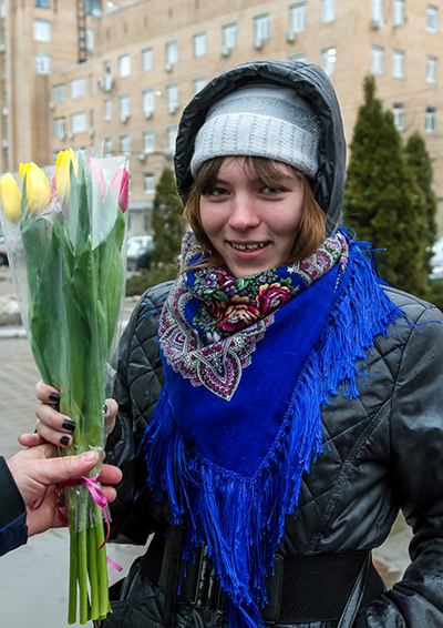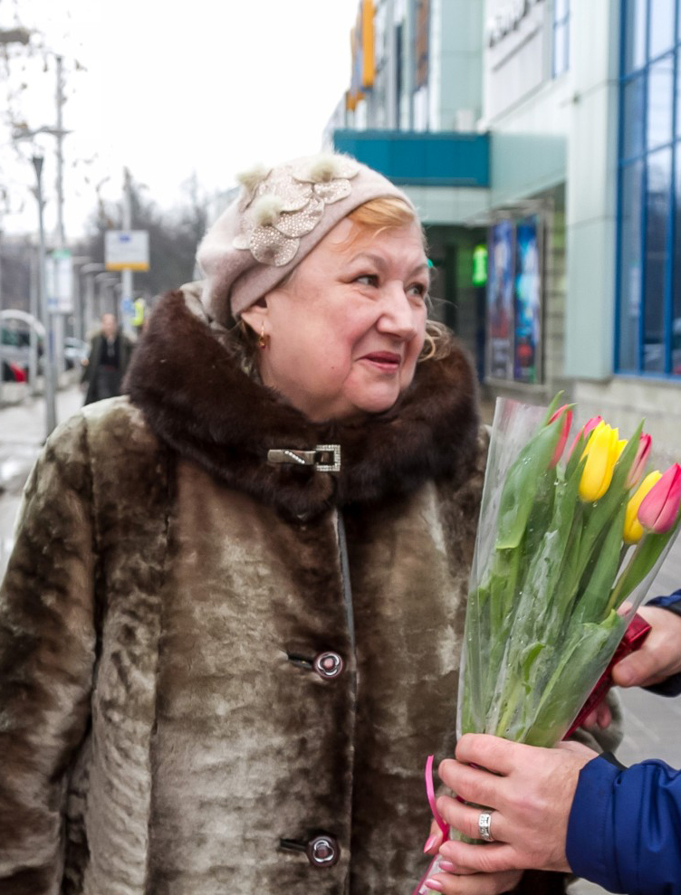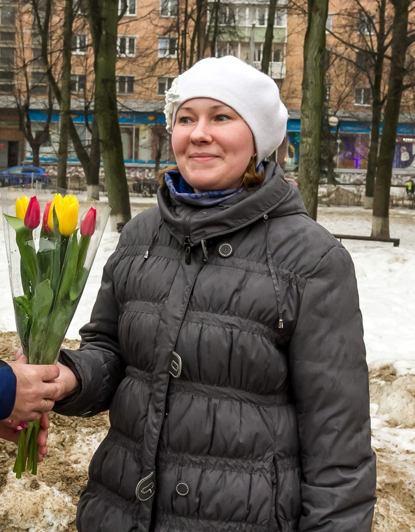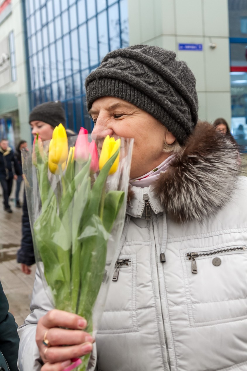 Этот проект так вдохновил нас, что мы решили провести аналогичную фотосессию на улицах Калуги. Ну а поскольку дело происходило накануне 8 Марта, мы запаслись не только комплиментами, но и букетами тюльпанов. Их нам любезно предоставил магазин строительных и отделочных материалов «Русские гвозди».