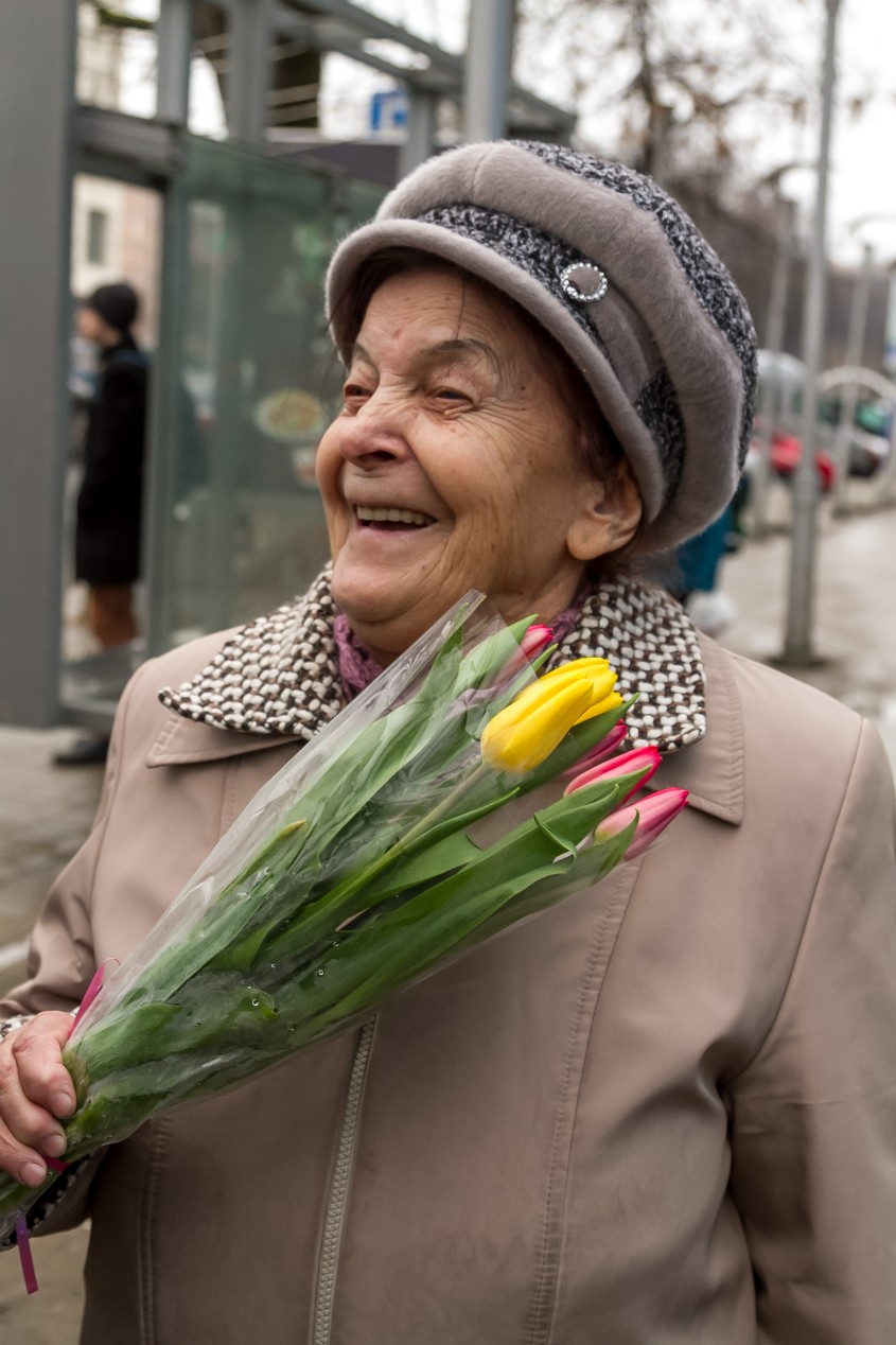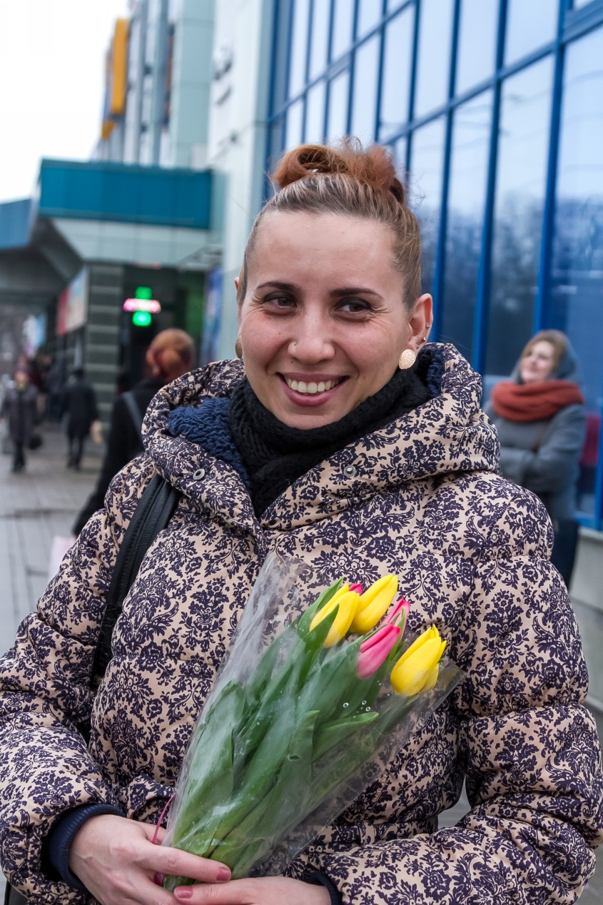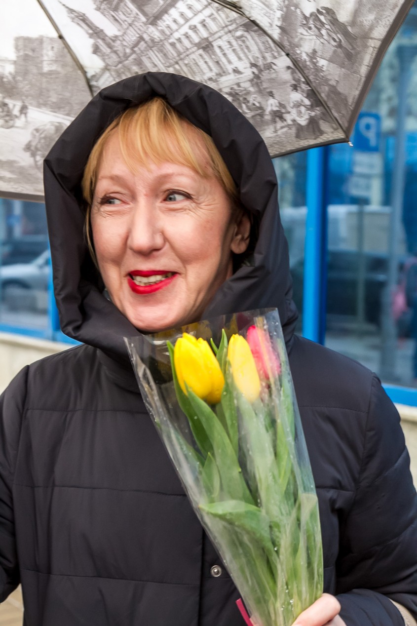 Выбранный для фотопрогулки день с точки зрения погодных условий оказался не самым подходящим: небо хмурилось, было ветрено, моросил дождь. В какой-то момент у нас появились некоторые сомнения: а вдруг наш план не сработает? Однако волновались напрасно: цветы и сказанные от души комплименты оказывают волшебное действие в любую погоду. Буквально на глазах наши случайные собеседницы, уставшие, иногда немного грустные, превращались в светящихся красавиц.