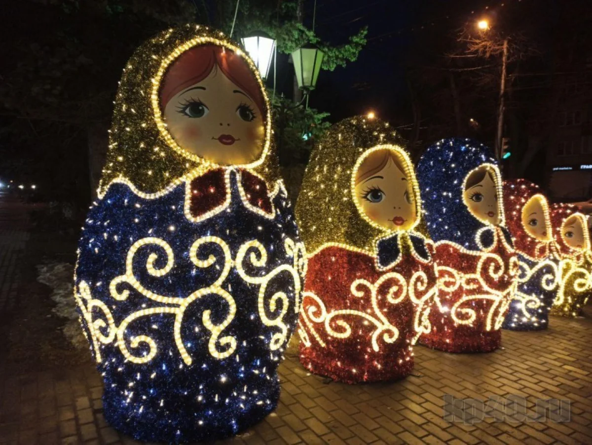 А Московскую площадь украсили пятью матрёшками. Светящаяся конструкция установлена рядом с административным зданием.
