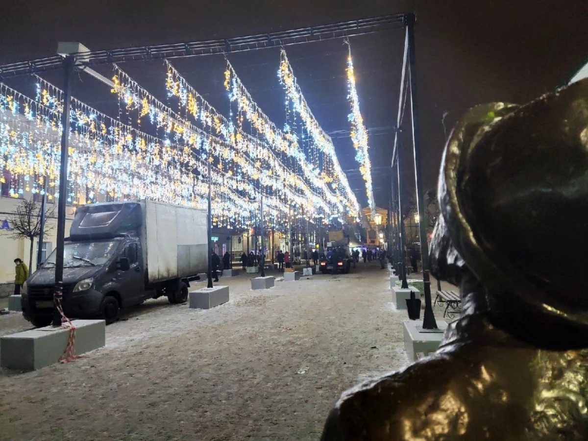 В Калуге уже несколько дней продолжаются работы по монтажу праздничного освещения на пешеходной части улицы Театральной. Вечером в понедельник, 14 декабря, огни уже частично зажгли.