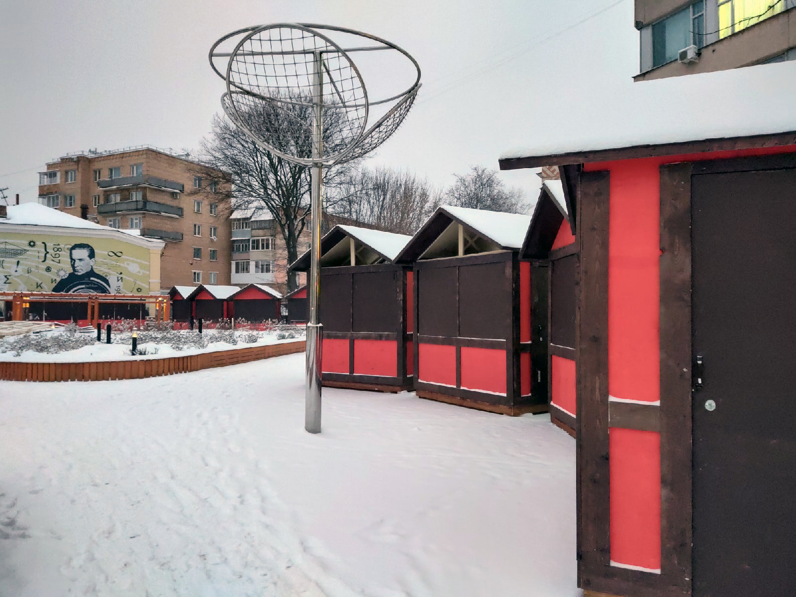 В соседнем сквере установлены павильоны. В рамках проекта «Новогодняя столица России-2021» здесь пройдет базар «Станция 1371». Ранее в городской управе рассказывали, что для этой площадки готовятся инсталляции на космическую тему.