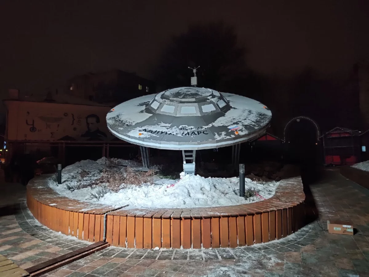Как мы уже рассказывали, в сквере на улице Ленина в Калуге рядом с городской управой установили необычный экспонат – летающую тарелку. Вечером 22 декабря там включили подсветку.
