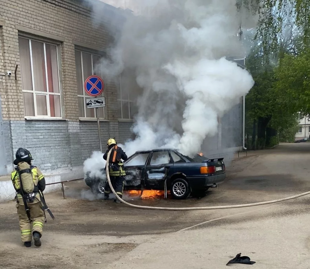Припаркованное у административного здания авто вспыхнуло в воскресенье, 7 мая, в начале третьего дня. Свидетели возгорания позвонили на пульт пожарной охраны города в 14.28.
