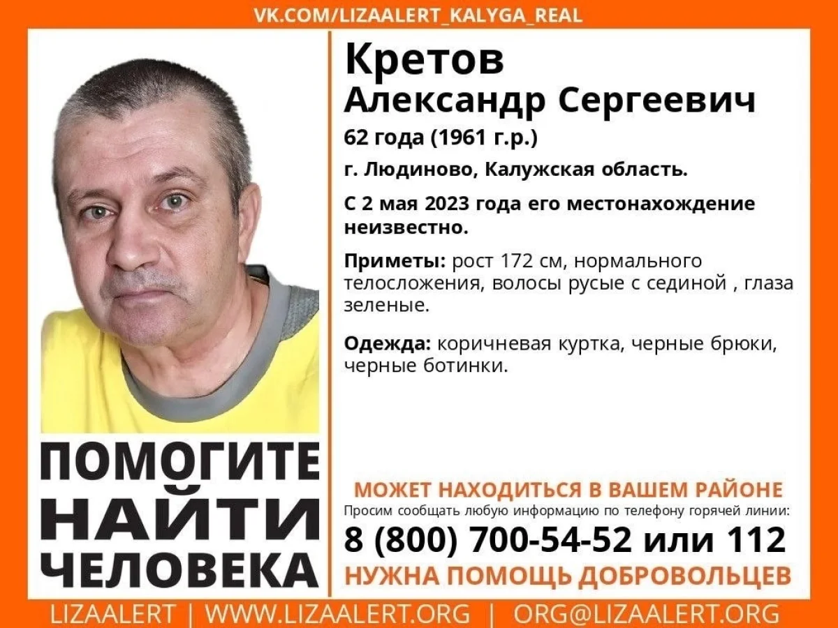 В понедельник, 8 мая, в поисково-спасательном отряде «ЛизаАлерт» Калужской области сообщили о пропаже в Людиново 62-летнего Александра Кретова.