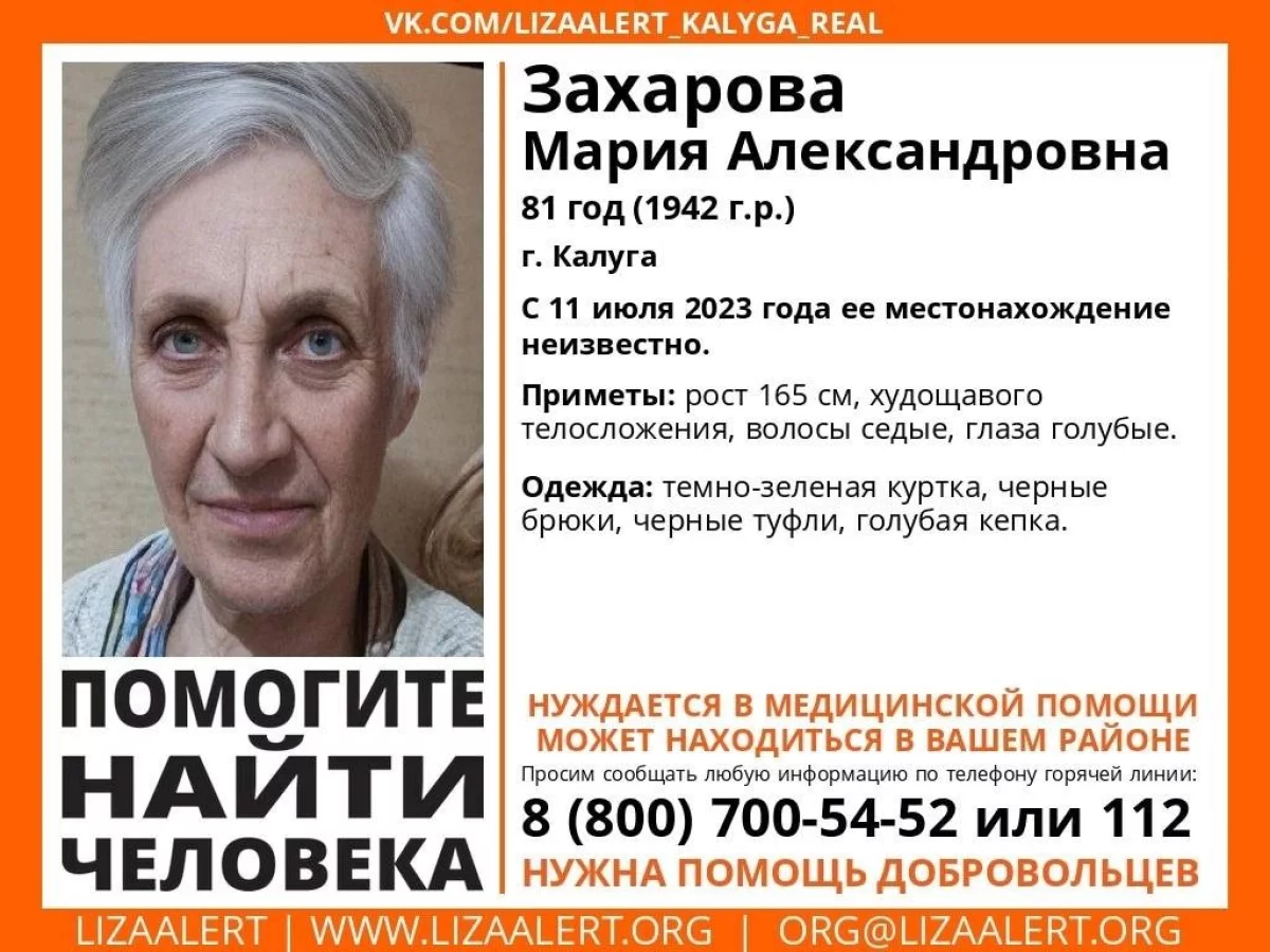 С 11 июля в Калуге ищут пропавшую 81-летнюю Марию Захарову. Об этом сообщили в поисково-спасательном отряде «ЛизаАлерт».