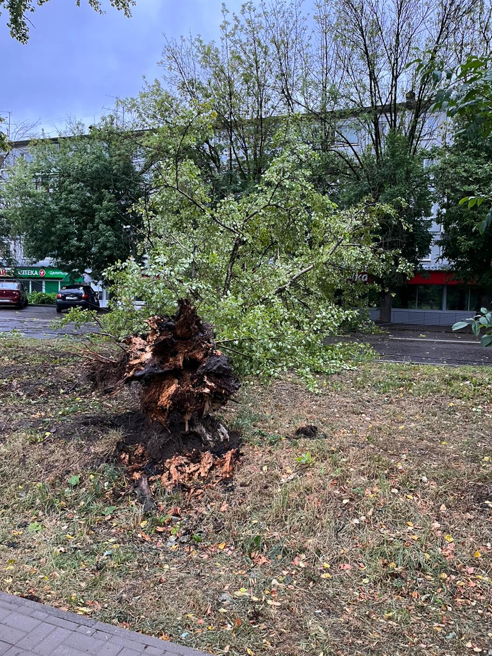 На улице Максима Горького в районе дома №41 огромное дерево упало прямо на дорогу, полностью перегородив проезд и оборвав провода.