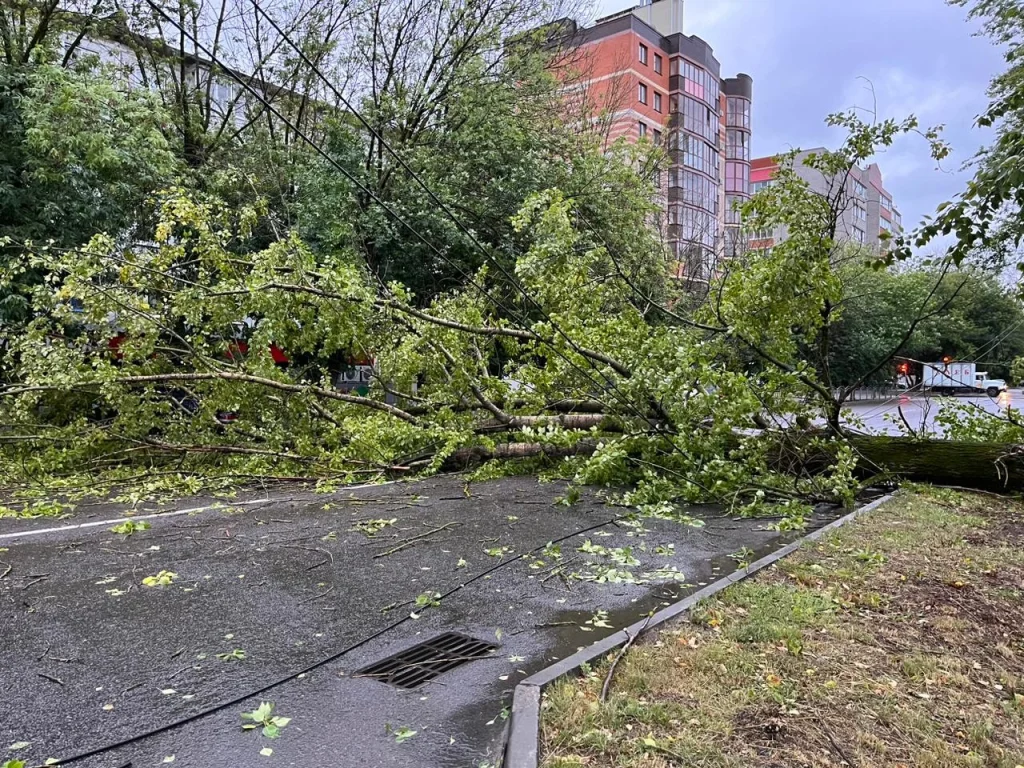 На улице Максима Горького в районе дома №41 огромное дерево упало прямо на дорогу, полностью перегородив проезд и оборвав провода.