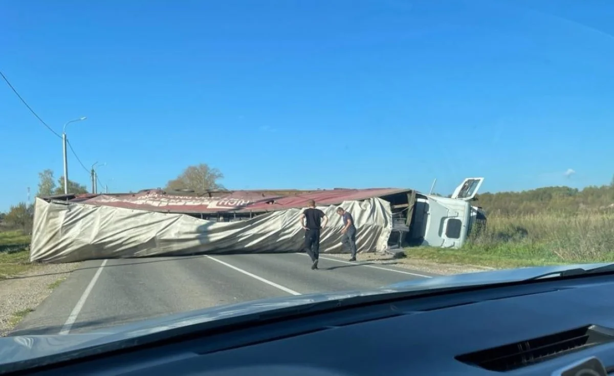 Утром в среду, 27 сентября, на дороге Калуга – Козельск перевернулась фура. Фото опубликовало сообщество «Дорожный дозор Калуга» в ВК.