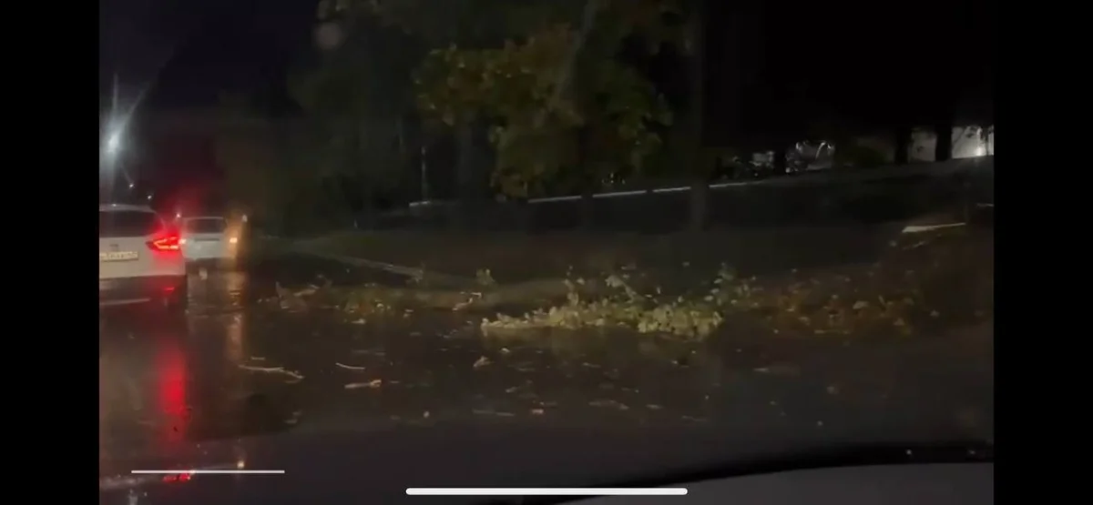 Калужане прислали видео, на котором видно, что на проезжей части между упавших стволов на аварийке стоит легковушка.