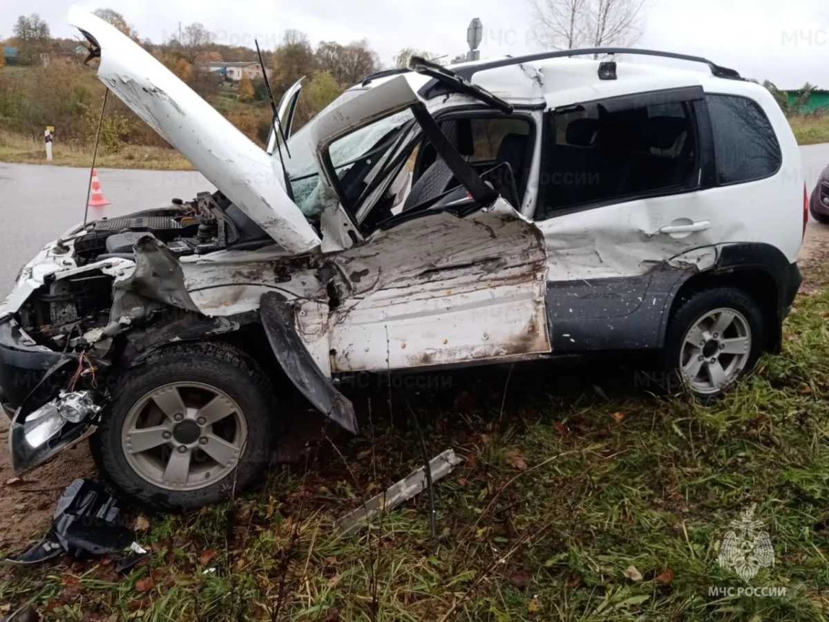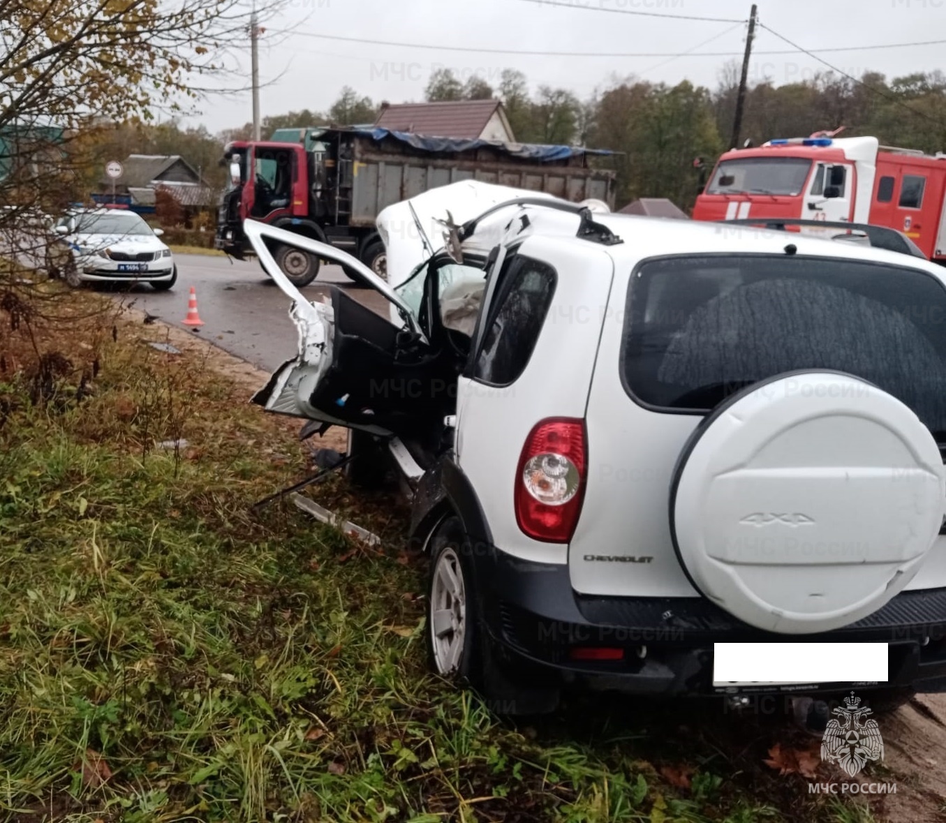 Около 10 утра в понедельник, 16 октября, автомобиль «Шевроле Нива» столкнулся с самосвалом «Скания» в деревне Галкино Дзержинского района. Фото с места происшествия опубликовало ГУ МЧС по Калужской области.