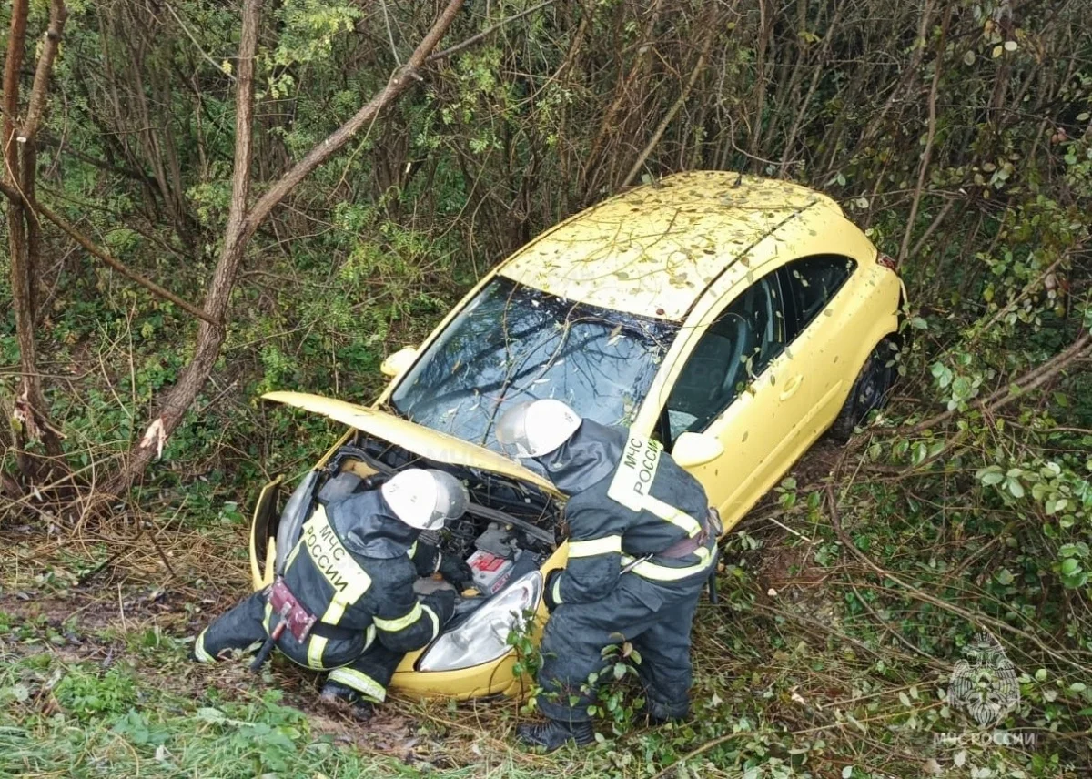 Около 13:00 в четверг, 19 октября, в Мещовском районе съехал в кювет и перевернулся автомобиль «Опель». Фото с места происшествия опубликовало ГУ МЧС по Калужской области.