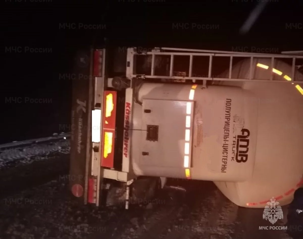 По предварительным данным, водитель грузовика «Скания» с цистерной не справился с управлением и врезался в столб. После этого автомобиль перевернулся.
