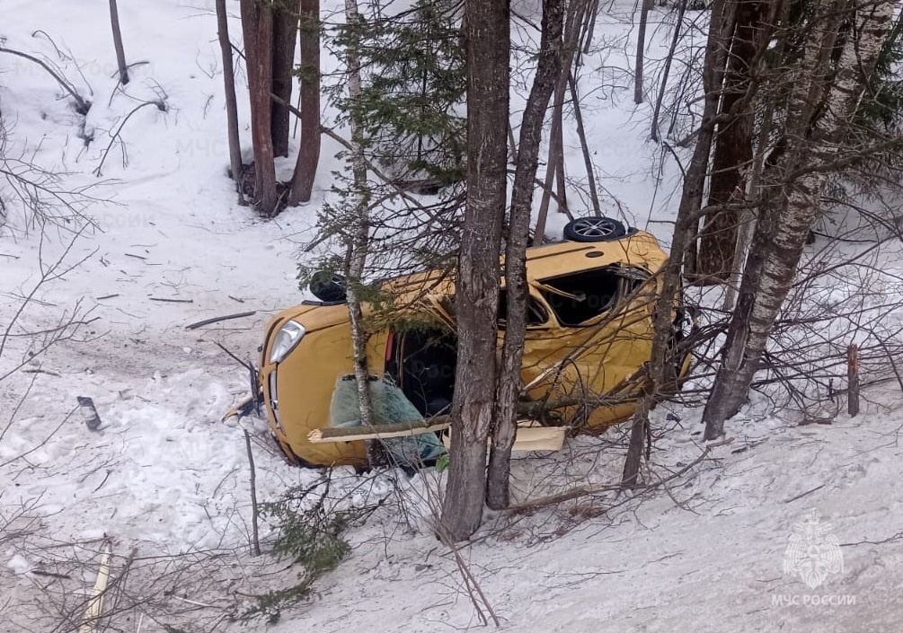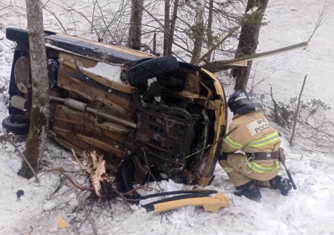 По предварительным данным, водитель легковушки не справился с управлением. Машина съехала в кювет, перевернулась и врезалась в дерево.