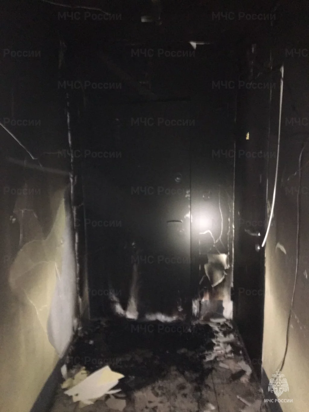 По предварительным данным, дверь подожгли. Никто из людей не пострадал.