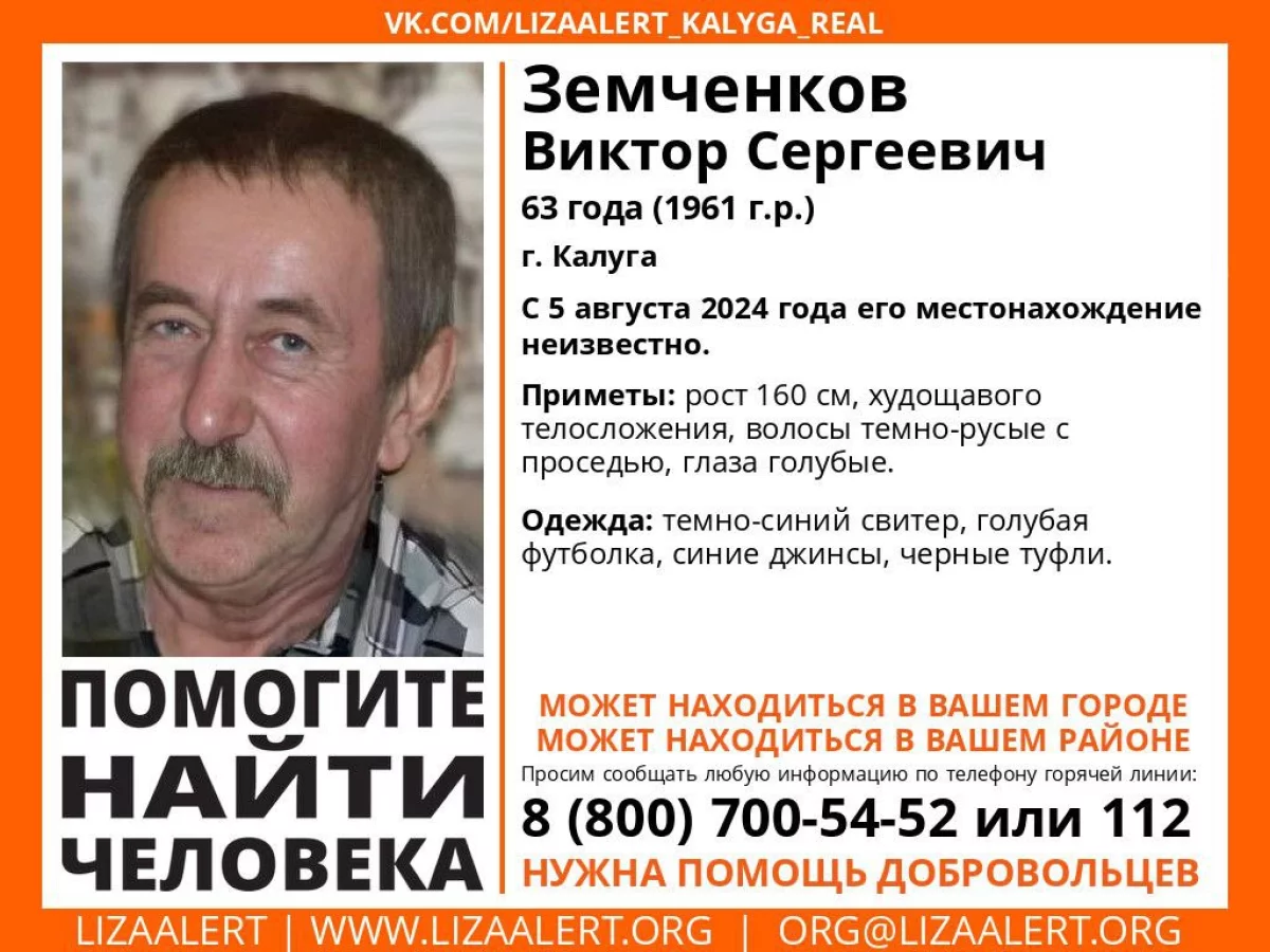 В Калуге пропал 63-летний Виктор Земченков. Об этом сообщили в поисково-спасательном отряда "ЛизаАлерт".