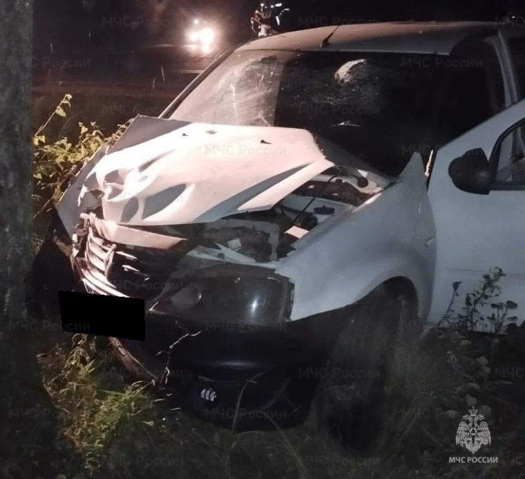 «Рено Логан» вылетел в кювет и врезался в дерево.