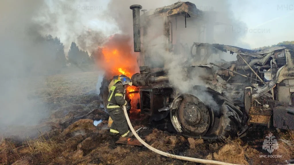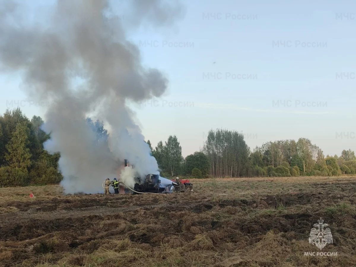Судя по фото, предоставленному региональным МЧС, трактор приказал долго жить. К счастью, пострадавших при пожаре на поле людей нет.