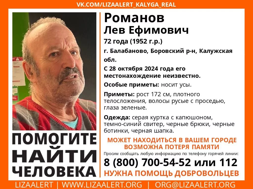 Лев Романов из города Балабаново Боровского района пропал в понедельник, 28 октября.