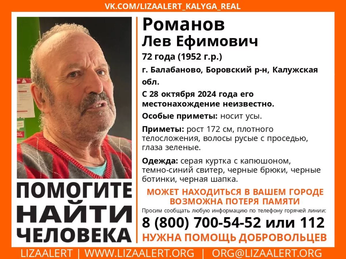 Волонтеры особо отмечают, что Романов страдает потерей памяти и просят незамедлительно сообщить любую информацию о его местоположении по бесплатному телефону 8 800 700-54-52.