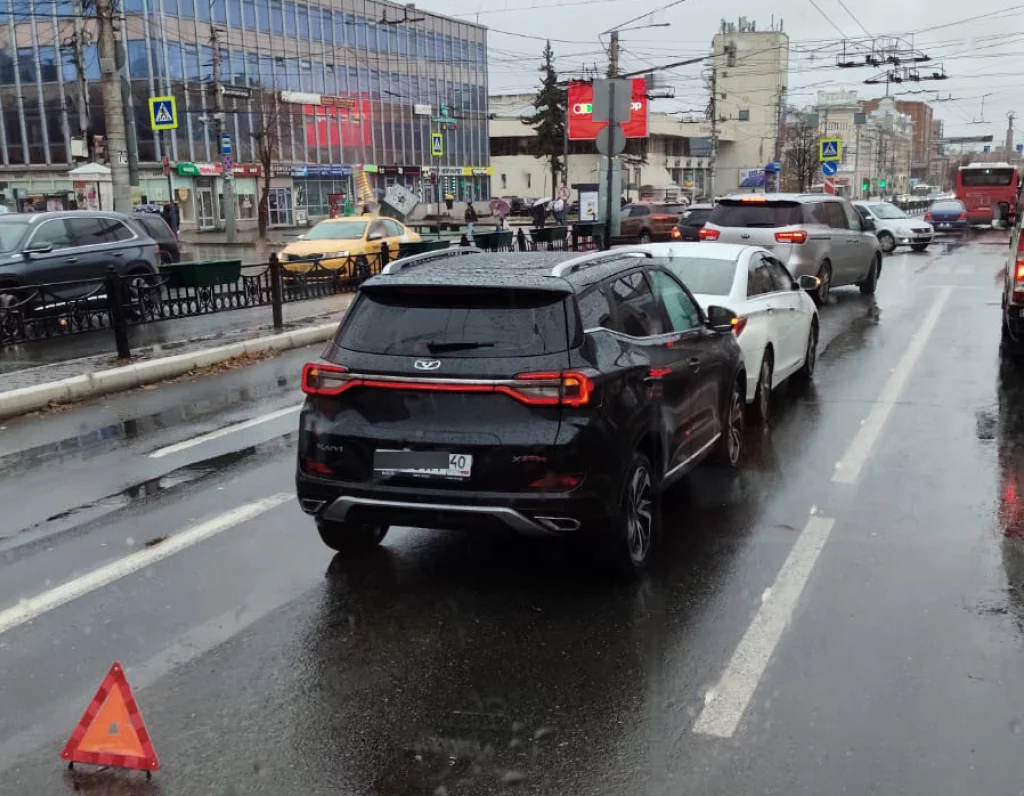 По предварительным данным, в среднем ряду столкнулись две машины, двигавшиеся со стороны Театральной площади. Фото опубликовали в сообществе «Калуга ДТП».