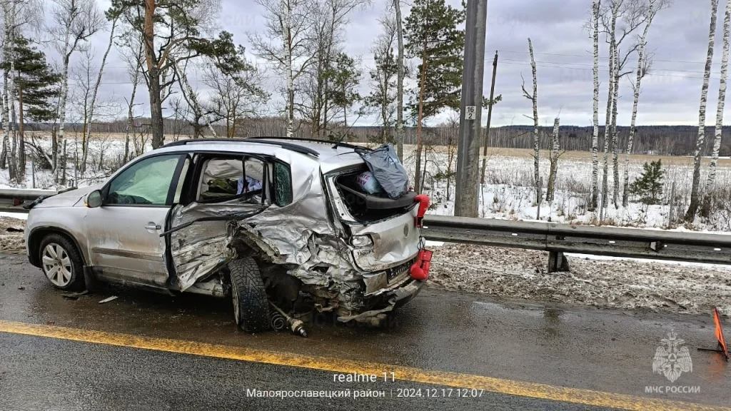 Недалеко от съезда на обход Калуги в Малоярославецком районе 37-летний водитель «Ленд Ровера» ехал в сторону Москвы и врезался в стоящий «Фольксваген».