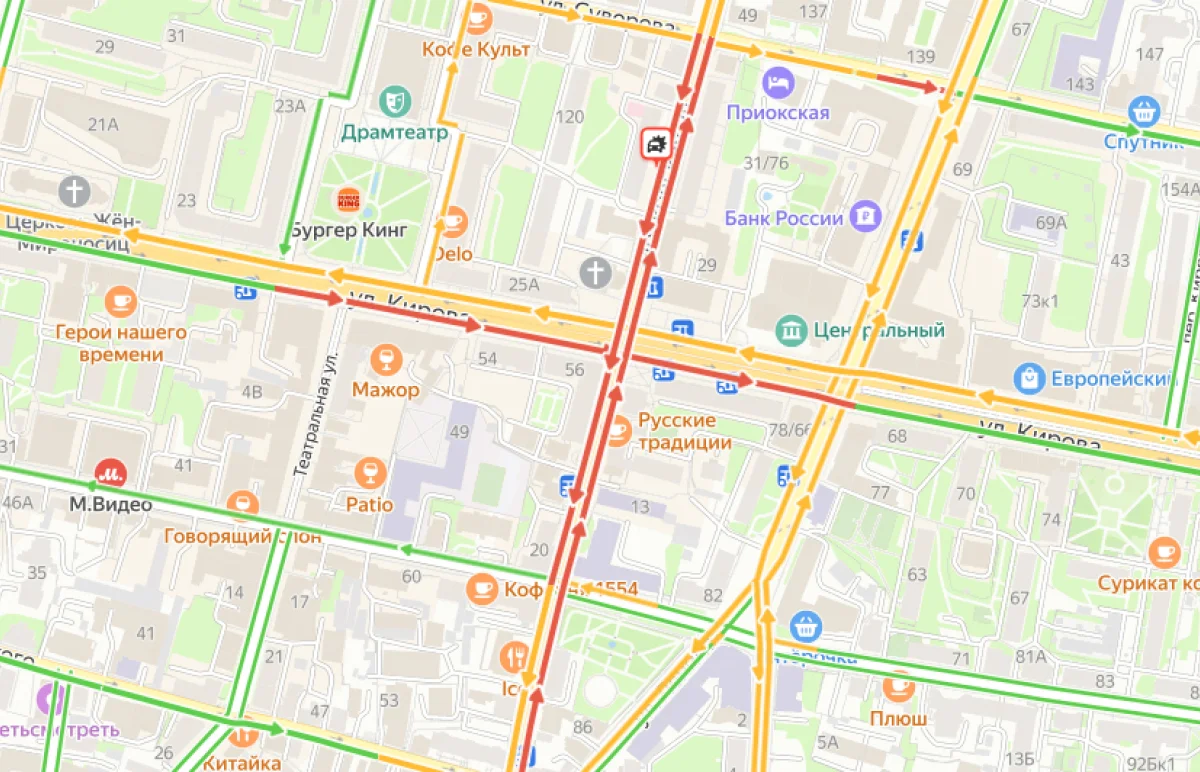 Движение затруднено на участке между улицами Ленина и Суворова.