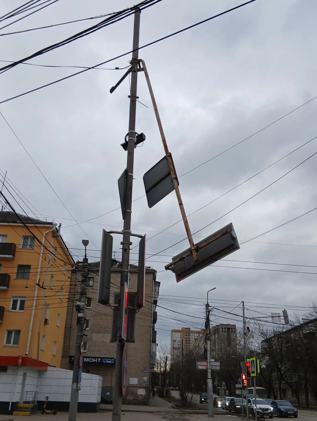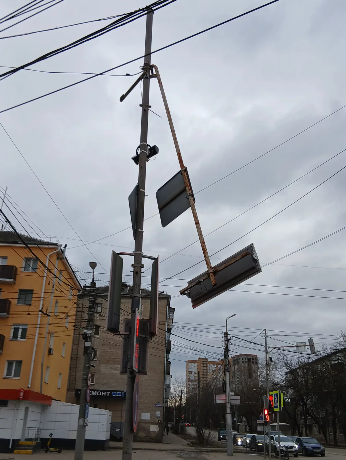 В Калуге сильный ветер погнул стойку светофора