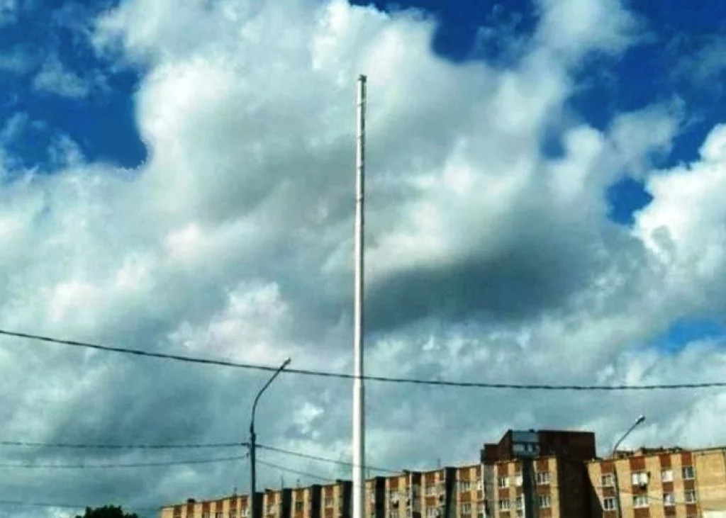 Сильный ветер, достигавший скорости 17 м/с, повредил государственный флаг России на 40-метровом флагштоке при въезде в Калугу.