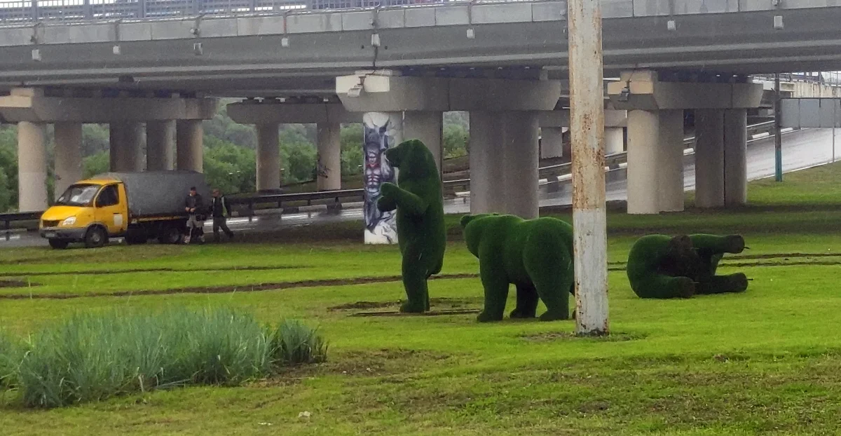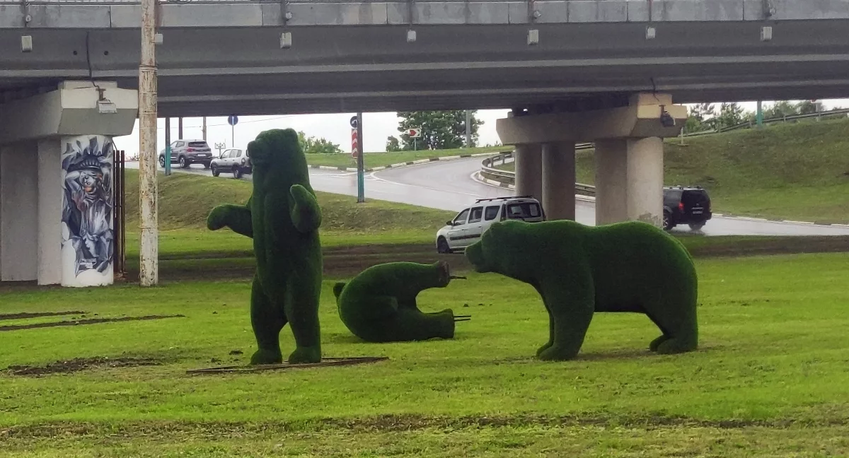 Одна из трех фигур медведей, которые уже много лет стоят у гагаринского моста, в понедельник, 30 июня, приняла горизонтальное положение.
