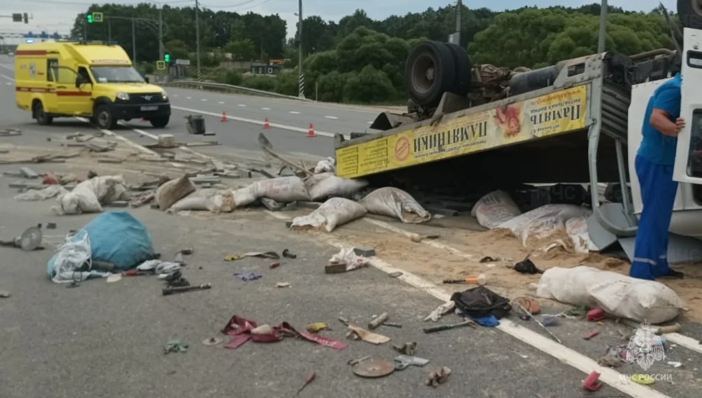 В Калужской области грузовик перевернулся из-за оторвавшегося колеса