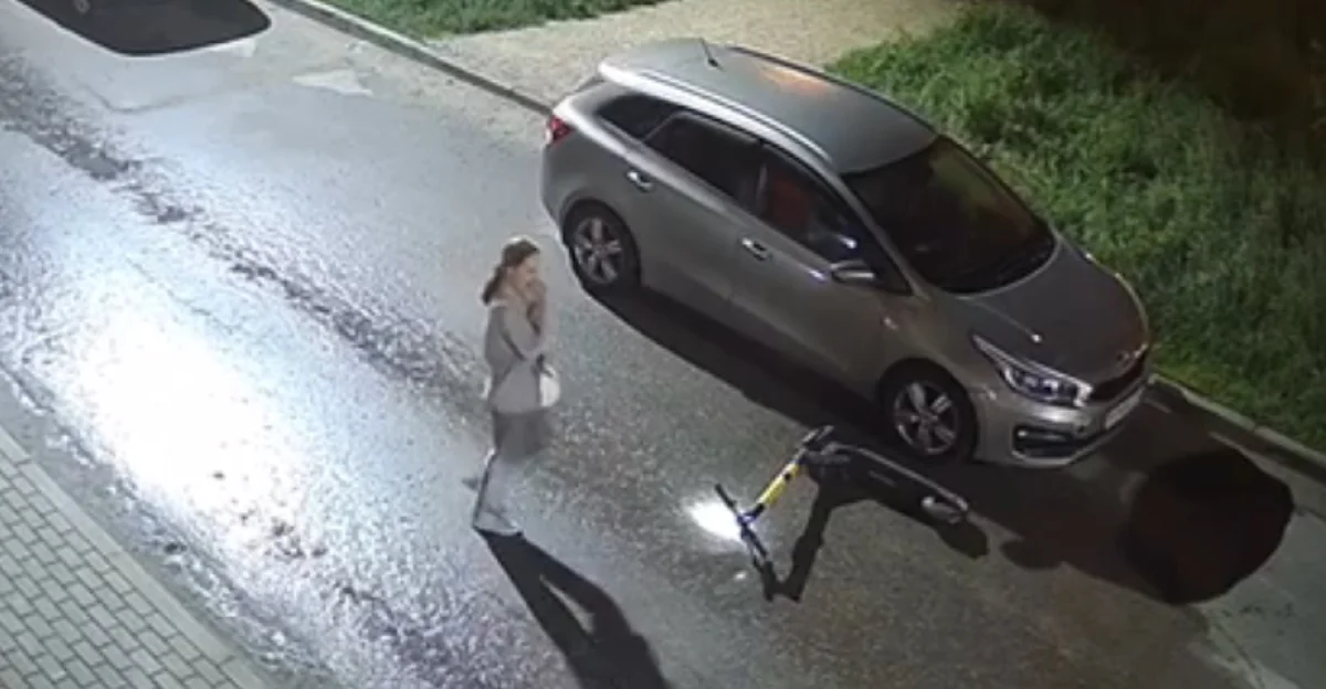 Судя по этим кадрам, две девушки катались на прокатных самокатах, а потом у одной транспорт покатился и помял капот припаркованного автомобиля «Киа».