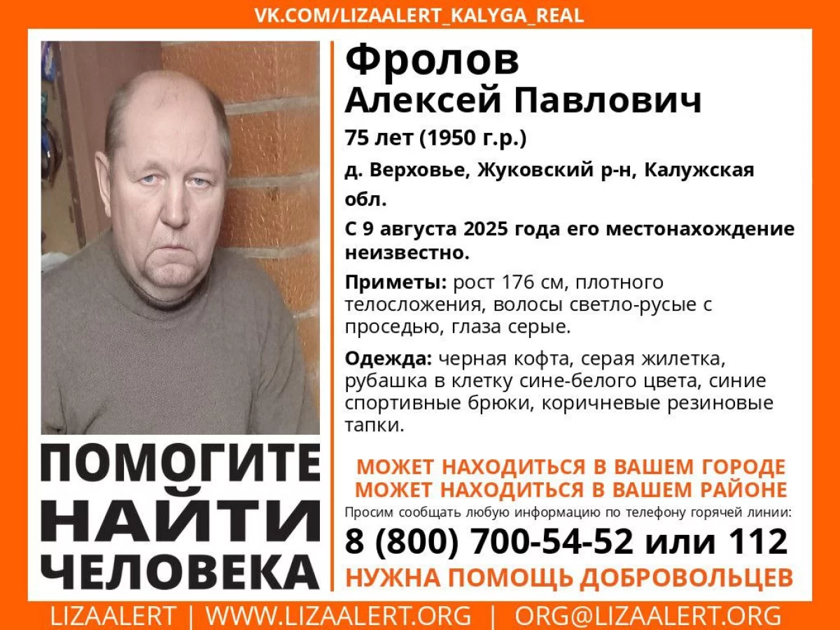 Алексей Павлович Фролов ушел из дома в деревне Верховье Жуковского района 9 августа, в субботу, и не вернулся