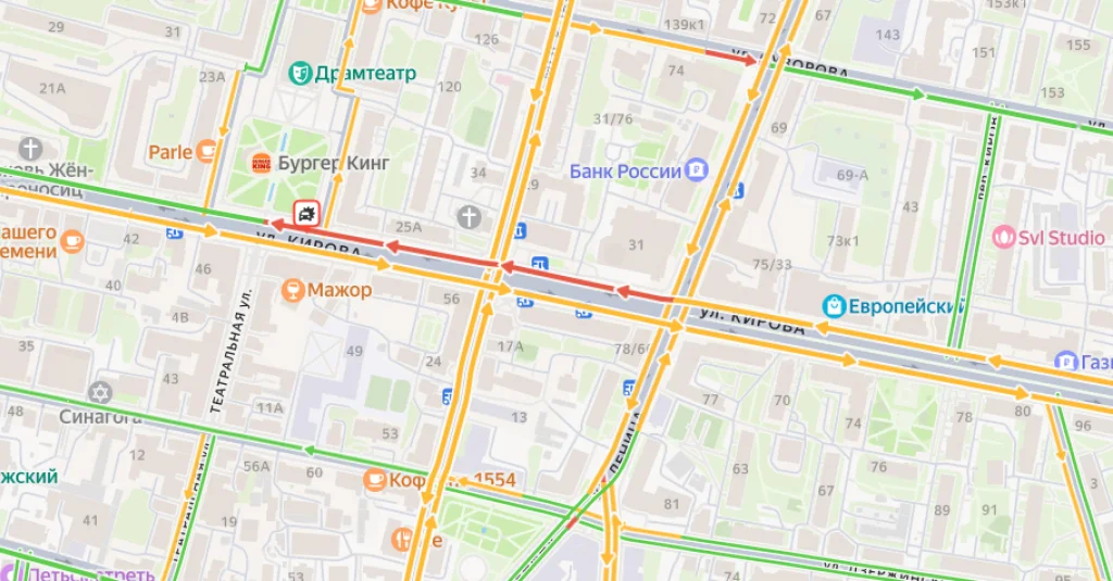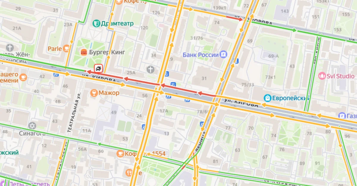 Затруднено движение в сторону сквера Мира. По предварительным данным, перекрыты две полосы.