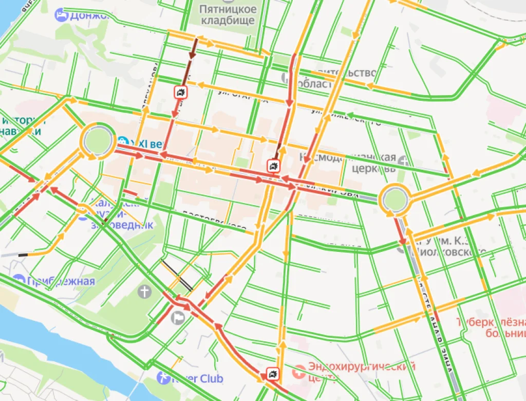 Аварии произошли на Кутузова в районе перекрестка с Луначарского, на Московской – в районе перекрестка с Кирова, а также на Рылеева – между Огарева и Суворова.