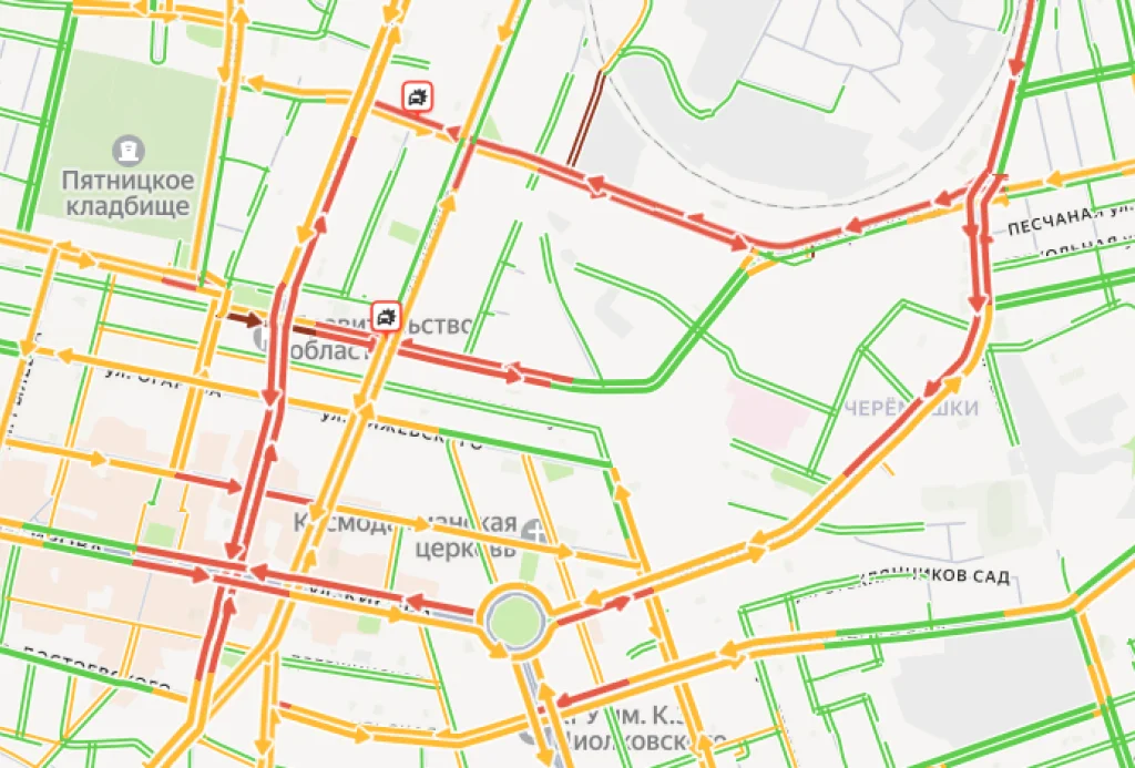 Стоят в пробках Карла Либкнехта, Баррикад, Московская, Ленина, Кирова, Жукова, Гагарина, Советская.